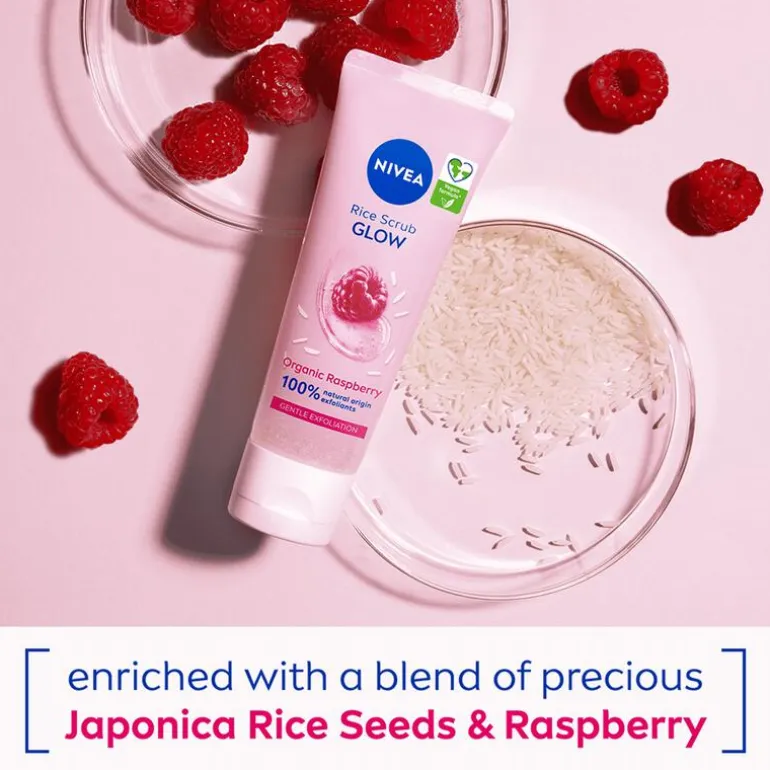 NIVEA Glow Rijstscrub is een diep reinigende en voedende scrub die je natuurlijke huidvernieuwing ondersteunt. Gebruik deze scrub om dagelijks je huid te reinigen. Dankzij de milde formule voor de gevoelige en droge huid kun je je huid exfoliëren zonder deze te irriteren. De NIVEA scrub verwijdert dode huidcellen, reinigt de huid en verfijnt je teint. Zo geniet je van een natuurlijke glow en een heerlijk zacht huidgevoel. Maak simpelweg de huid nat en masseer de rijstscrub in de huid.Deze gezichtsscrub onderscheidt zich door de verzorgende bestanddelen die het mild en effectief maken. De kostbare Japonica-rijstzaden worden verbrijzeld en gezeefd, en gemengd met biologisch frambozensap voor een frisse scrub met verzorgende kwaliteiten. De rijst fungeert als antioxidant, terwijl de vitaminen in het frambozensap kalmerend, verzachtend en hydraterend werken. De subtiele scrubdeeltjes verwijderen dode huidcellen, waardoor je een egale teint krijgt. • Reinigt mild en verwijdert dode huidcellen zonder de huid te irriteren• Verrijkt met Japonica-rijstzaden en framboos• Stimuleert de huidvernieuwing• Verfijnt en versterkt het huidoppervlak, voor een frisse huid• Verzacht de huid