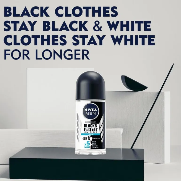 NIVEA MEN Black & White Invisible biedt bescherming tegen witte vlekken op zwarte kleding en tegen gele vlekken op witte kleding dankzij de unieke gepatenteerde anti-vlekken technologie. Het biedt betrouwbare 72 uur anti-transpirantbescherming, krachtig tegen zweet en geuren, en verzorgt je huid. De formules bevatten geen ethylalcohol. NIVEA Black & White biedt complete bescherming tegen zweet, geuren, vlekken, resten en irritaties, terwijl het zacht is voor de huid. Huidverdraagzaamheid dermatologisch bewezen. Onze anti-transpiranten bieden Derma 72u Active Protection: onze producten werken samen met de huid voor betrouwbare en krachtige werking tegen zweet en geur, met huidvriendelijke formules.