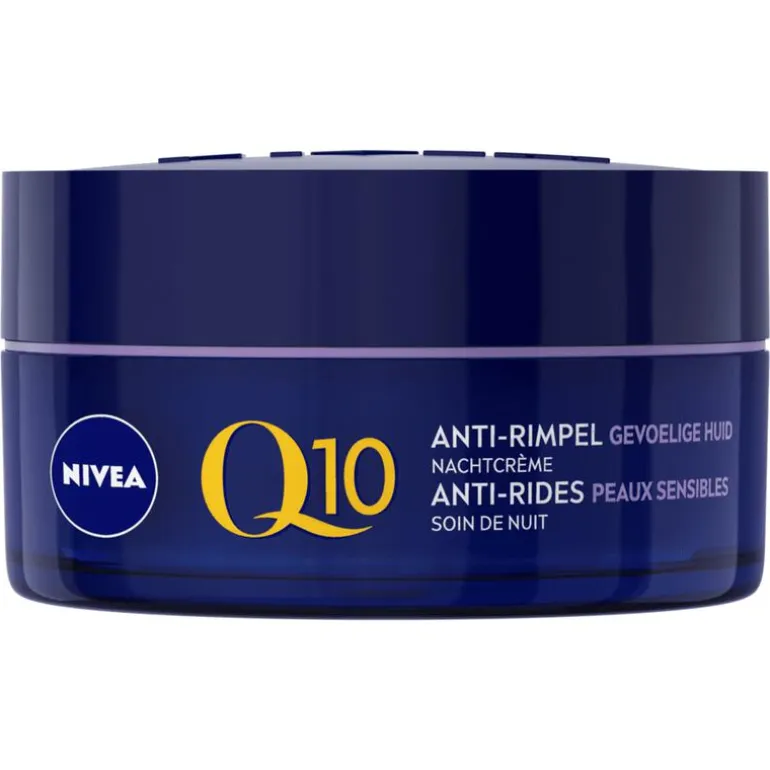 Geef je gevoelige huid de ultieme verzorging met NIVEA Q10 POWER Anti-Rimpel Sensitive Nachtcrème. Deze crème doet zijn werk terwijl je slaapt, wanneer je huid het meest ontvankelijk is voor voedende bestanddelen. Ervaar de voedende en herstellende kracht van de nachtcrème, die de tekenen van de gevoelige huid effectief aanpakt. Zo ervaar je minder roodheid, droogheid en trekkerigheid wanneer je de huid dagelijks verzorgt met deze anti-age hydraterende gezichtscrème. Tegelijkertijd worden rimpels en fijne lijntjes zichtbaar minder en voelt je huid steviger aan.NIVEA Q10 POWER Anti-Rimpel Sensitive Nachtcrème bevat kalmerende zoethoutextract, dat roodheid en droogheid tegengaat. De formule met Q10 en creatine stimuleert de collageenaanmaak, waardoor rimpels verminderen. Deze parfumvrije crème is dermatologisch getest en zorgt voor een zachtere, stevigere huid. • Verstevigt de huid en vermindert rimpels en fijne lijntjes• Vermindert de drie tekenen van de gevoelige huid• Met Q10, creatine en zoethout• Parfumvrije formule• Ontwikkeld voor de gevoelige huid