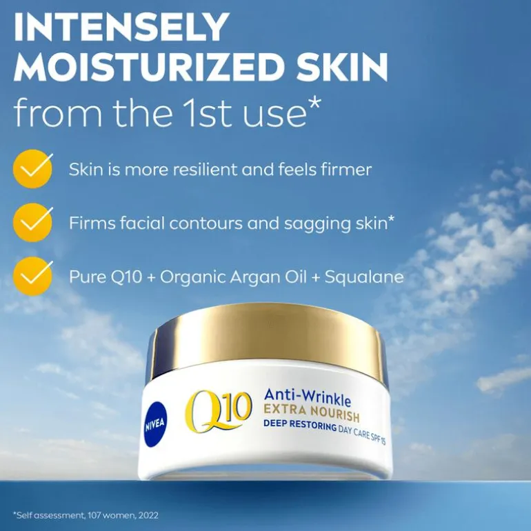NIVEA Q10 is een extra voedende dagcrème voor de droge huid. De anti-rimpel formule geeft extra energie en bestrijdt het huidverouderingsproces. De dagcrème bevat Q10, een stof die 100% identiek is aan het huideigen Q10. Deze stof remt de natuurlijke huidveroudering en werkt als een beschermende antioxidant. Creatine maakt het een verstevigende crème, die natuurlijke huidverstevigende vezels stimuleert*. De dagcrème met SPF 15 bevat ook arganolie. Dit heeft een voedende en verzachtende werking.De samenstelling van de anti-rimpel crème is aangepast aan de behoefte van de droge huid. De crème voelt licht aan, maar zorgt toch voor diepe hydratatie. Tegelijkertijd versterkt de dagcrème met SPF 15 de huidbarrière. Zo zorgt de toegevoegde Q10 voor bescherming tegen schadelijke stoffen van buitenaf. Al deze factoren maken de Q10 anti-rimpel NIVEA dagcrème een perfecte start van je dag.*in vitro getest • Voedt de droge huid intensief gedurende 24 uur• Verstevigt de huid voelbaar• Vermindert zichtbaar rimpels• Hydrateert de huid intensief• Beschermt de huid tegen invloeden van buitenaf