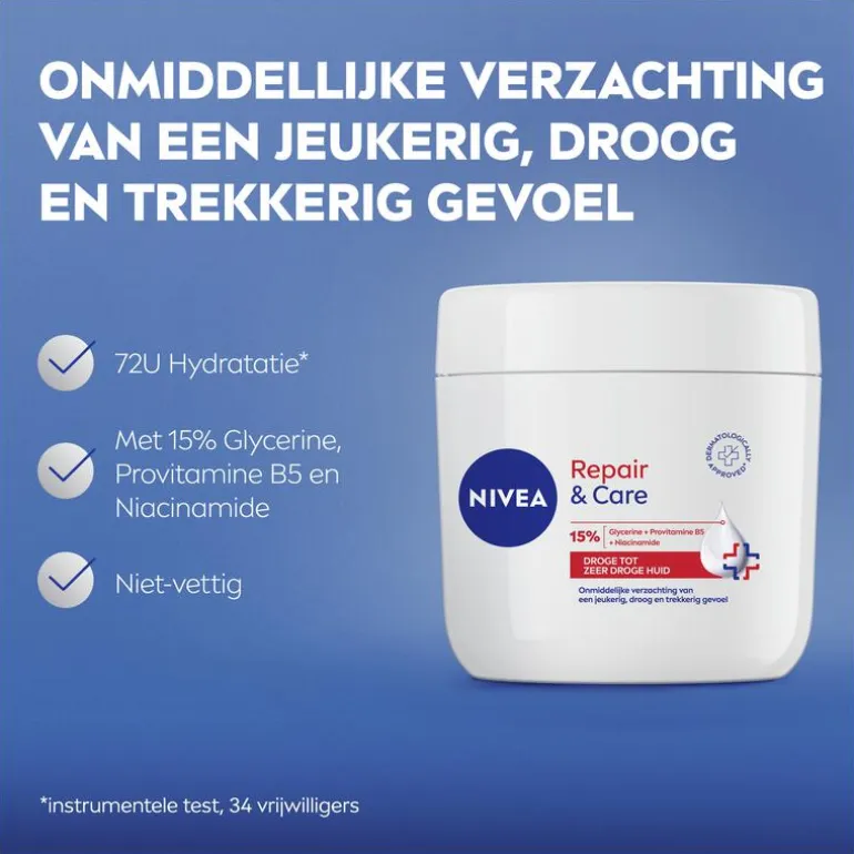 Krijg onmiddellijke verlichting van een droge en zeer droge huid met NIVEA Repair & Care Intensive Crème. Deze intensief verzorgende crème zorgt voor 72U* lang hydratatie en voeding, waardoor de huid zacht en glad aanvoelt. De unieke formule beschermt en versterkt de huidbarrière om verder vochtverlies te voorkomen. Deze crème zorgt voor een langdurig huidcomfort. Met 15% Glycerine, Provitamine B5 en Niacinamide heeft de formule sterke hydraterende eigenschappen. Ervaar de kracht van NIVEA Repair & Care Intensive crème voor een gezond ogende huid. Speciaal ontwikkeld voor droge en zeer droge huid, de formule is hypoallergeen, niet-vet, trekt snel in en is ook geschikt voor kinderen vanaf 3 jaar. Huidvriendelijkheid dermatologisch getest.