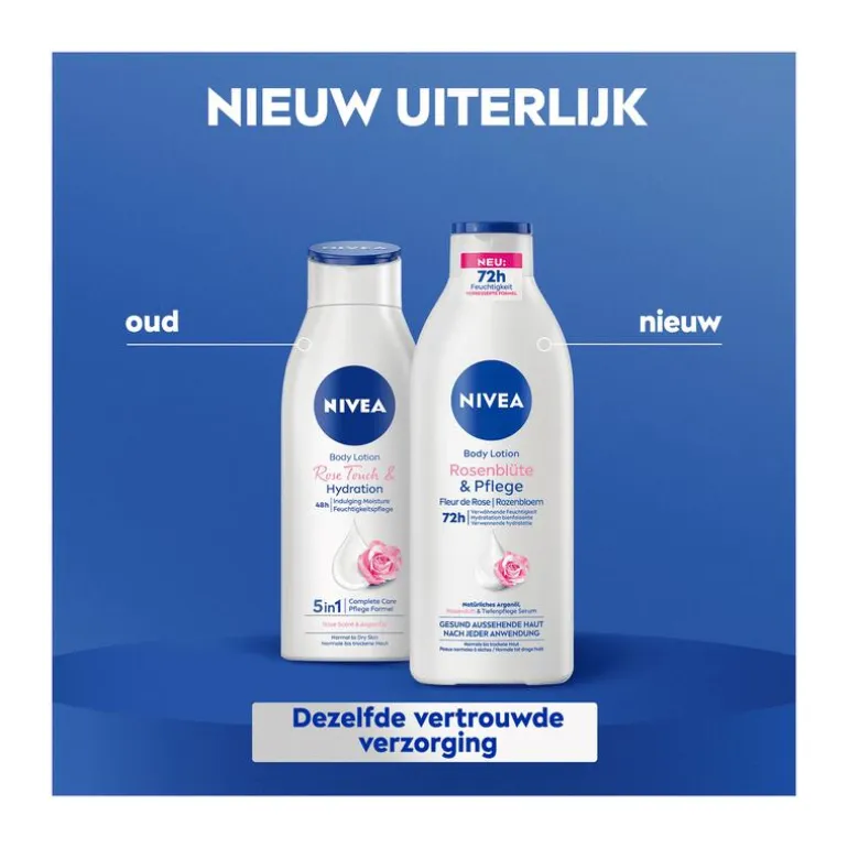 Geef je huid de ultieme verzorging die ze verdient met de NIVEA Rozenbloem Bodylotion, nu met een nieuwe en verbeterde formule. Deze bodylotion biedt tot wel 72 uur* intensieve hydratatie, zodat je huid niet alleen zacht en soepel aanvoelt, maar er ook gezond uitziet na elk gebruik. De formule is verrijkt met natuurlijke arganolie, bekend om haar voedende eigenschappen, en een speciaal voedend serum dat de huid intensief verzorgt. Bovendien wordt je huid omhuld door een heerlijk subtiel aroma van rozen, wat zorgt voor een luxe verzorgingsbeleving.