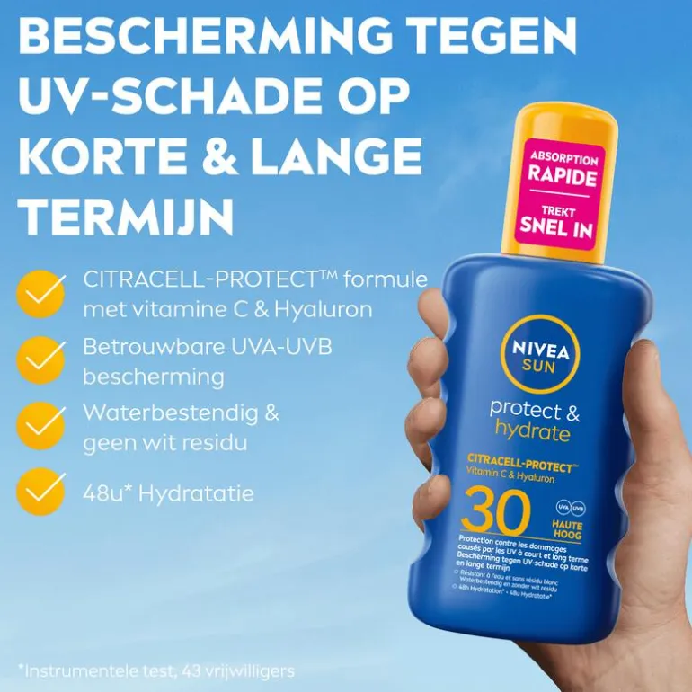 Geef je huid de bescherming die het verdient met de NIVEA SUN Protect & Hydrate Spray SPF30. Deze zonnespray biedt betrouwbare UVA/UVB-bescherming en beschermt je huid tegen UV-schade op korte en lange termijn. Dankzij de innovatieve CitraCell-ProtectTM-formule met vitamine C en hyaluron wordt een extra beschermingslaag gecreëerd die je huid niet alleen beschermt, maar ook hydrateert. De lichte formule trekt snel in, is eenvoudig aan te brengen en laat geen vettig gevoel of wit residu achter.Met een hydraterende werking die tot 48 uur* aanhoudt, zorgt deze zonnebrand spray ervoor dat je huid zacht en gezond aanvoelt, zelfs tijdens intensieve blootstelling aan de zon. Of je nu op zoek bent naar een effectieve zonnebrandcrème gezicht, een handige zonnebrand spray voor onderweg, of een betrouwbare keuze voor de hele familie, deze zonnespray voldoet aan al je verwachtingen.Perfect te combineren met je favoriete aftersun voor een complete zonverzorgingsroutine. *Instrumentele test, 43 vrijwilligers