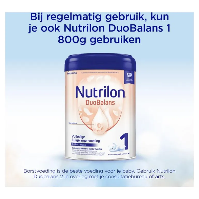 BELANGRIJK• Borstvoeding is de beste voeding voor je baby.• Wil je Nutrilon DuoBalans 1 gebruiken? Overleg dan met je verloskundige, consultatiebureau of arts.• Nutrilon &Balans 1 is een volledige zuigelingenvoeding op basis van melk, geschikt vanaf de geboorte indien geen borstvoeding gegeven wordt of in combinatie met borstvoeding.