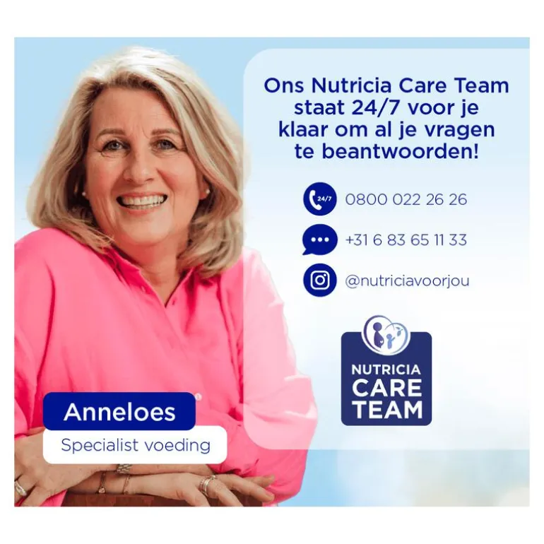 Wij zijn er voor jou, zelfs om 3 uur ‘s nachts! Onze voedingskundigen staan 24/7 voor je klaar. Bel voor vragen ons Nutricia Care Team op: 0800 022 26 26