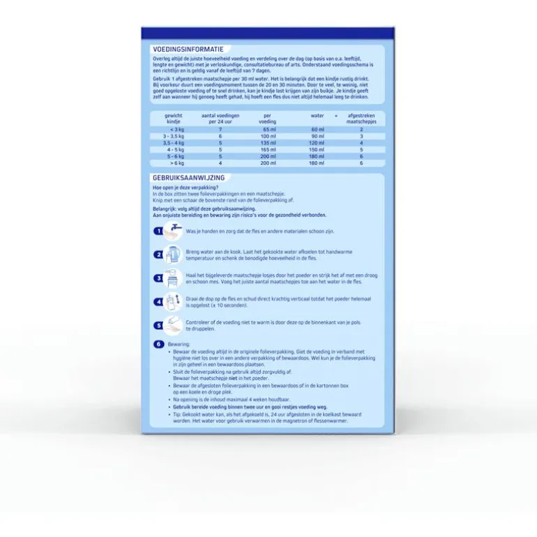 1. Was je handen en zorg dat de fles en andere materialen schoon zijn. 2. Breng water aan de kook. Laat het gekookte water afkoelen tot handwarme temperatuur en schenk de benodigde hoeveelheid in de fles. 3. Haal het bijgeleverde maatschepje losjes door het poeder en strijk het af met een droog en schoon mes. Voeg het juiste aantal maatschepjes toe aan het water in de fles. 4. Draai de dop op de fles en schud direct krachtig verticaal totdat het poeder helemaal is opgelost (± 10 seconden). 5. Controleer of de voeding niet te warm is door deze op de binnenkant van je pols te druppelen. 6. Bewaar de voeding altijd in de originele folieverpakking. Giet de voeding in verband met hygiëne niet los over in een andere verpakking of bewaarbus. Wel kun je de folieverpakking in zijn geheel in een bewaardoos plaatsen.