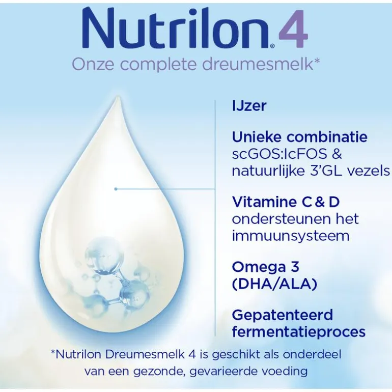 BELANGRIJKNutrilon Dreumesmelk 4 is geschikt als onderdeel van een gezonde, gevarieerde voeding.