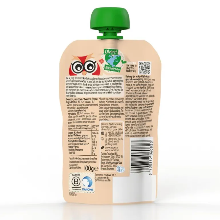 Olvarit Knijpfruit Banaan Aardbei, geschikt voor baby’s vanaf 6 maanden oud.