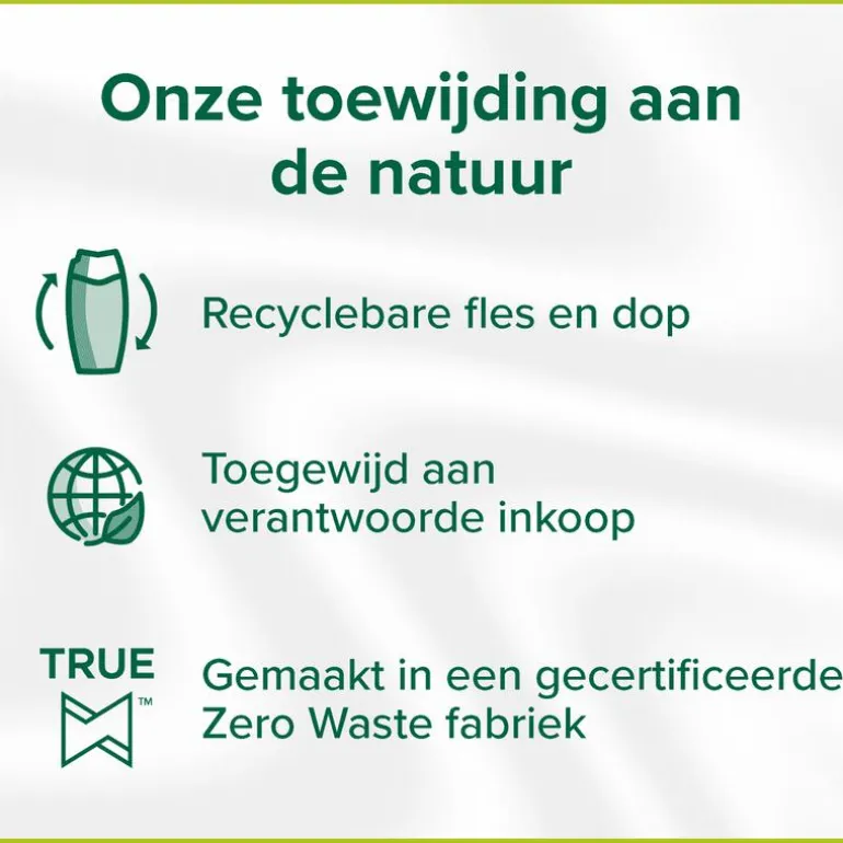 De douchecrème bevat niet alleen plantaardige melk, maar is ook gemaakt met ingrediënten van 95% natuurlijke oorsprong**. De bodywash heeft een voor 98% biologisch afbreekbare formule en zit in een recyclebare fles. De vegan douchecrème is ook dermatologisch getest.