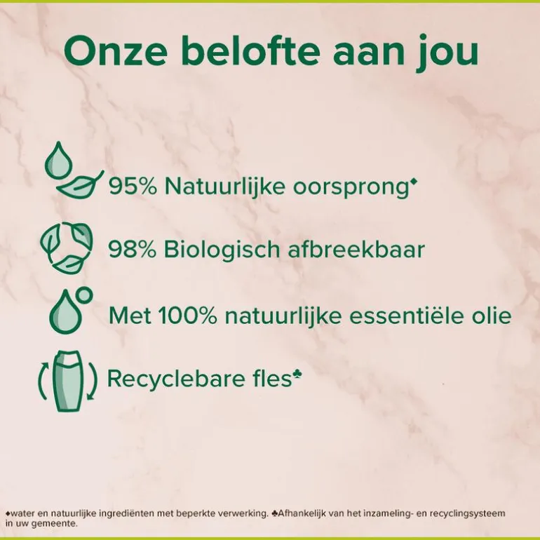 Deze douchegel is gemaakt met ingrediënten van 95% natuurlijke oorsprong* en heeft een formule die voor 95% biologisch afbreekbaar is. De bodywash bevat ook 100% natuurlijke essentiële olie voor een luxueuze douche-ervaring waardoor je je helemaal verwend voelt. De douchegel zit in een fles die voor 30% uit gerecycled plastic bestaat en volledig recyclebaar is.