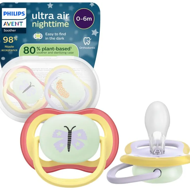 De Philips Avent Ultra Air Nighttime fopspeen heeft extra grote luchtgaten om de huid van je baby droog te houden. Met de glow-in-the-dark functie kun je de fopspeen altijd makkelijk terugvinden zonder het licht aan te doen. De fopspeen van 100% siliconenmateriaal helpt bij de natuurlijke ontwikkeling van de mond en bootst het gevoel van de borst na. Vervang spenen elke 4 weken om hygiënische redenen.