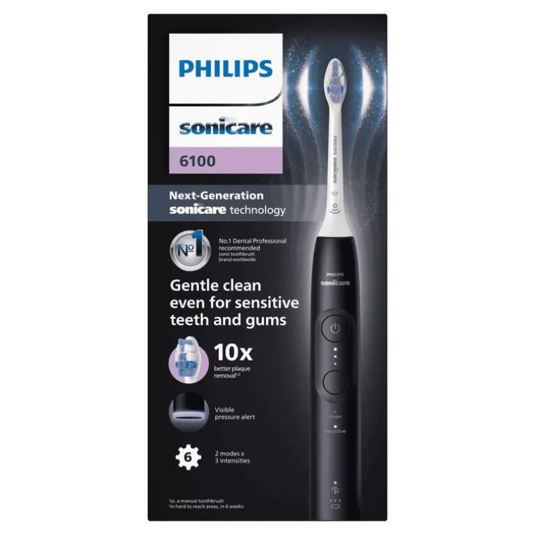 De Philips Sonicare 6100 Series elektrische tandenborstel wordt geleverd met de Sensitive-opzetborstel, geschikt voor mensen met gevoelige tanden en tandvlees. Daarnaast laat de tandenborstel weten wanneer je te hard poetst en wanneer je de opzetborstel moet vervangen. Na één oplaadbeurt gaat de tandenborstel maar liefst 3 weken mee.