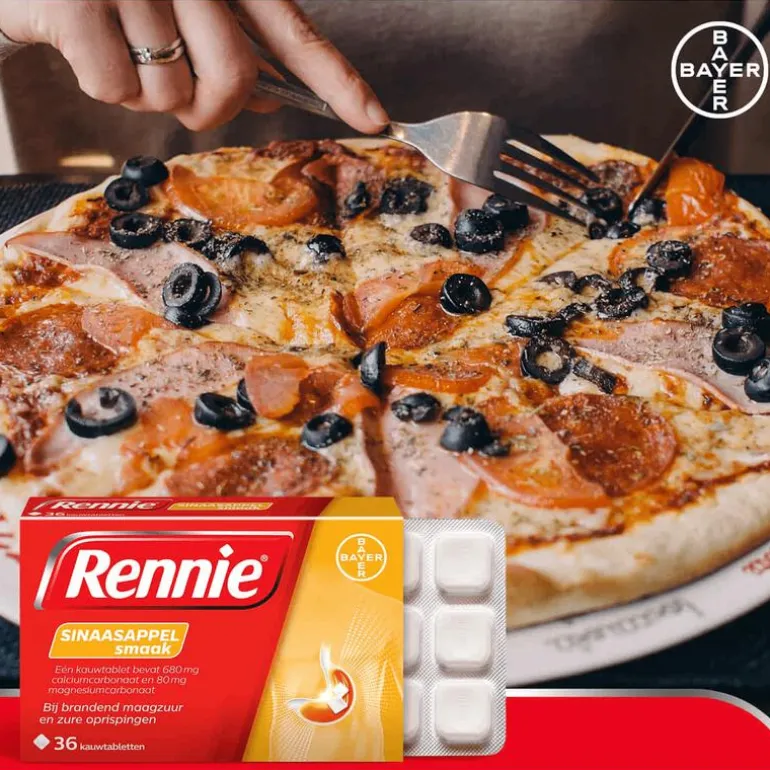 Vettig eten, pittig eten en alcohol zijn bekende triggers van brandend maagzuur, maar soms word je alsnog overvallen door dat branderige gevoel in je slokdarm. Rennie verlicht brandend maagzuur en zure oprispingen gelukkig binnen 2 minuten. Je maag is snel weer rustig zodat je weer van je dag of avond kunt genieten. Rennie is een maagzuurtablet en staat bekend als een maagzuurbinder. Dat betekent dat het overtollig maagzuur in je maag omzet in water en andere lichaamseigen stoffen. Dat gebeurt al binnen 2 minuten na inname. Zodra je last hebt van reflux, kun je 1 tot 2 kauwtabletten innemen, waardoor de klachten snel en voor enkele uren af zullen nemen.Rennie is geschikt voor volwassenen en kinderen vanaf 12 jaar, maar kan ook door zwangere vrouwen gebruikt worden. Als je zwanger bent, raadpleeg dan wel je verloskundje of (huis)arts. Heb je last van winderigheid, probeer dan eens Rennie Deflatine. Voor een dubbele werking is er Rennie Duo, die brandend maagzuur neutraliseert maar ook een beschermend laagje om de maaginhoud legt. Daardoor is de kans kleiner dat brandend maagzuur opnieuw in de slokdarm terecht komt.
