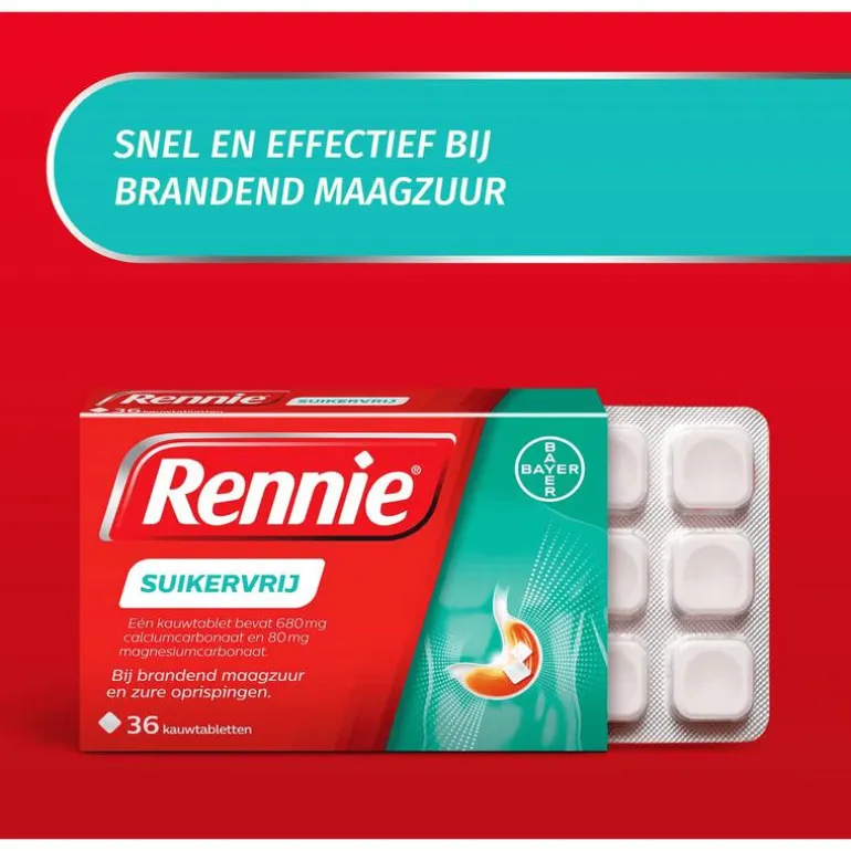 Vettig eten, pittig eten en alcohol zijn bekende triggers van brandend maagzuur, maar soms word je alsnog overvallen door dat branderige gevoel in je slokdarm. Rennie verlicht brandend maagzuur en zure oprispingen gelukkig binnen 2 minuten. Je maag is snel weer rustig zodat je weer van je dag of avond kunt genieten. Rennie is een maagzuurtablet en staat bekend als een maagzuurbinder. Dat betekent dat het overtollig maagzuur in je maag omzet in water en andere lichaamseigen stoffen. Dat gebeurt al binnen 2 minuten na inname. Zodra je last hebt van reflux, kun je 1 tot 2 kauwtabletten innemen, waardoor de klachten snel en voor enkele uren af zullen nemen.Rennie is geschikt voor volwassenen en kinderen vanaf 12 jaar, maar kan ook door zwangere vrouwen gebruikt worden. Als je zwanger bent, raadpleeg dan wel je verloskundje of (huis)arts. Heb je last van winderigheid, probeer dan eens Rennie Deflatine. Voor een dubbele werking is er Rennie Duo, die brandend maagzuur neutraliseert maar ook een beschermend laagje om de maaginhoud legt. Daardoor is de kans kleiner dat brandend maagzuur opnieuw in de slokdarm terecht komt.