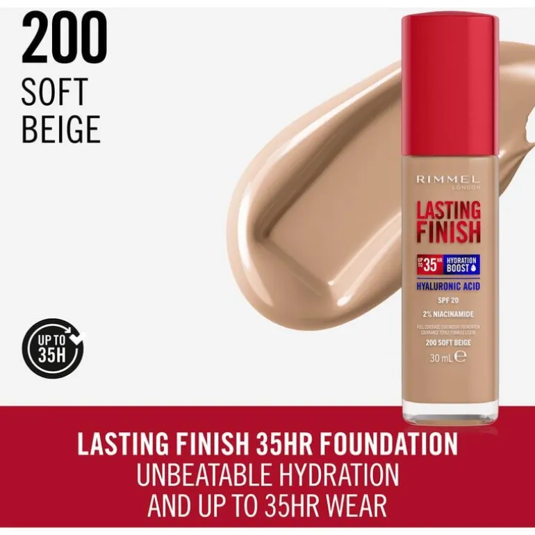 Geniet van ongelooflijke hydratatie en een tot wel 35-uur langhoudend kleurresultaat met Rimmel London Lasting Finish 35 Hour Foundation, Rimmels meest hydraterende en langhoudende foundation.•Een vegan foundation met een luchtige formule die je huid optimaal laat ademen en haar voorziet van een hoogdekkend kleurresultaat met een natuurlijk ogende finish•Klinisch bewezen verbeterde uitstraling van de huid•Clean foundation (D5-vrij) met een dierproefvrije en vegan formule, verrijkt met hyaluronzuur, vitamine E en 2% niacinamide voor een ongelooflijke hydratatieboost•Met SPF20 om de huid te beschermen tegen de schadelijke effecten van zonlicht, de huidbarrière te beschermen tegen vrije radicalen en oxidatieve stress (luchtvervuiling en blauw licht).•Vloeibare foundation met waterbestendige formule en veegvaste textuur die niet afgeeft en niet in de huidplooitjes gaat zitten