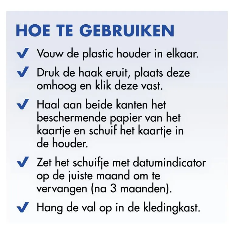 Gebruiksaanwijzing: 1. Verwijder het witte beschermpapier van de lijmlaag 2. Sluit de val door deze in elkaar te steken en klap eventueel de hanger naar buiten toe uit 3. Plaats, zet of hang de val in de gewenste ruimte. Controleer regelmatig op de vangst van motten 4. De val na maximaal 8 weken vervangen en met het huisvuil verwijderen. Gebruik 1 val per kast of ruimte (maximaal 30m2). Samenstelling: Deze val bestrijdt motten. Deze komen op de val af en worden dan door de lijmlaag op de val vastgehouden.