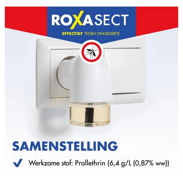 Gebruiksaanwijzing: – Controleer vooraf of het juiste voltage (230V) aanwezig is -Verwijder de draaidop van het flesje en draai het flesje in zijn geheel in de stekker totdat het flesje vast zit – Plaats de stekker in het stopcontact – De stekker kan, indien gewenst, 90 graden gedraaid worden. De rode schakelaar dient zich echter altijd aan de bovenkant te bevinden – De stekker moet met de schakelaar aan-en uitgezet worden. De aanbeveling is om 2 uur voor het slapen gaan de stekker al aan te zetten. Overdag de stekker uitzetten – De stekker niet met natte handen of metalen voorwerpen aanraken en niet bedekken met een natte doek of ander materiaal – De stekker werkt in een ruimte van ongeveer 30m3 – Niet gebruiken in slaapkamers van kinderen jonger dan 2 jaar. Samenstelling: Prallethrin (6,7 g/L (0,87% ww). Inhoud: 1x flesje 360 uur / 30 m2. De Roxasect Anti-Mug stekker is ook verkrijgbaar in: – Startverpakking: 1 stekker en 1 flesje 360 uur/30m2 – Navulverpakking;1 flesje 360 uur/ 30 m2