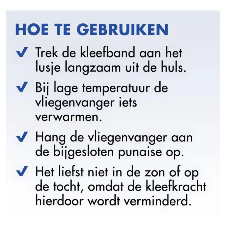 Trek de kleefband aan het lusje langzaam uit de huls. Bij lage temperatuur de vliegenvanger iets verwarmen. Hang de vliegenvanger aan de bijgesloten punaise op, liefst niet in de zon of op de tocht, aangezien hierdoor de kleefkracht vermindert.