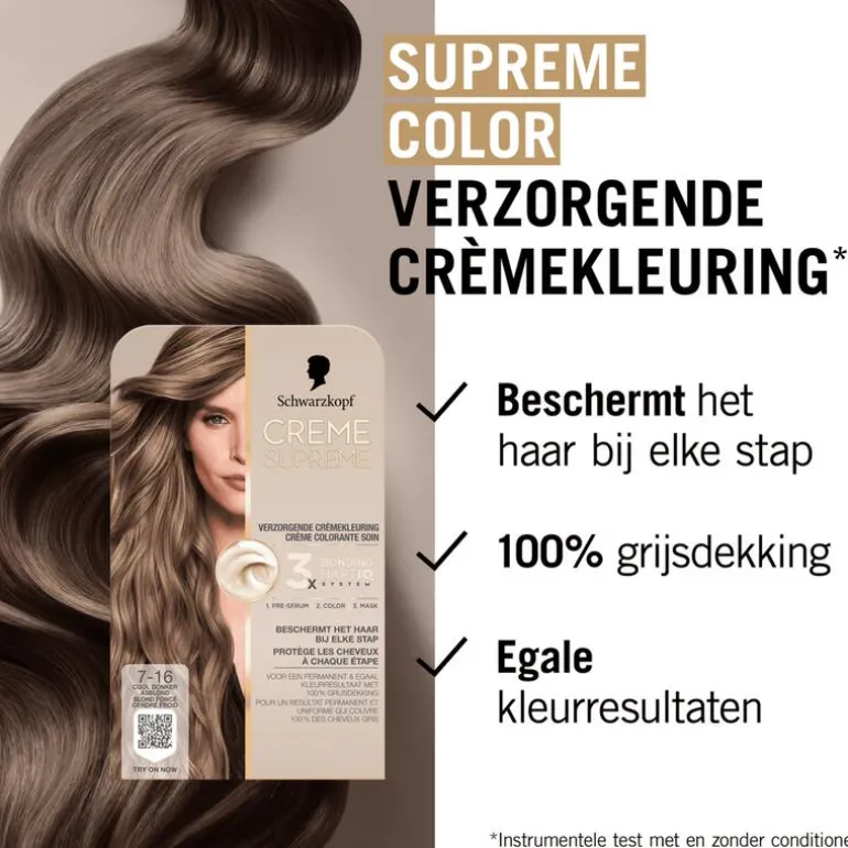 Meer dan 120 jaar geleden legde de Duitse chemicus en apotheker Hans Schwarzkopf de basis voor een merk dat sindsdien altijd voorop heeft gelopen op het gebied van innovatie. De combinatie van kwaliteitsingrediënten en de nieuwste haarverzorgingstechnologie, betrouwbaarheid, expertise en vakmanschap zijn de hoekstenen van alles wat het merk doet en waar het voor staat. Creme Supreme is de meest verzorgende permanente haarkleuring van Schwarzkopf, met het 3x Bonding HAPTIQ System dat het haar beschermt bij elke stap : voor, tijdens en na het kleuren.