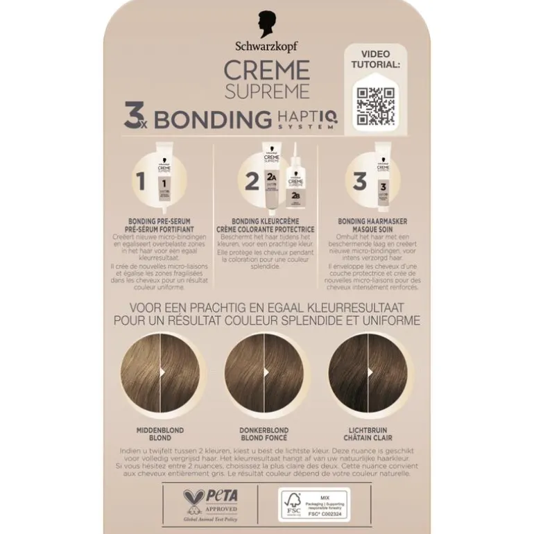Meer dan 120 jaar geleden legde de Duitse chemicus en apotheker Hans Schwarzkopf de basis voor een merk dat sindsdien altijd voorop heeft gelopen op het gebied van innovatie. De combinatie van kwaliteitsingrediënten en de nieuwste haarverzorgingstechnologie, betrouwbaarheid, expertise en vakmanschap zijn de hoekstenen van alles wat het merk doet en waar het voor staat. Creme Supreme is de meest verzorgende permanente haarkleuring van Schwarzkopf, met het 3x Bonding HAPTIQ System dat het haar beschermt bij elke stap : voor, tijdens en na het kleuren.