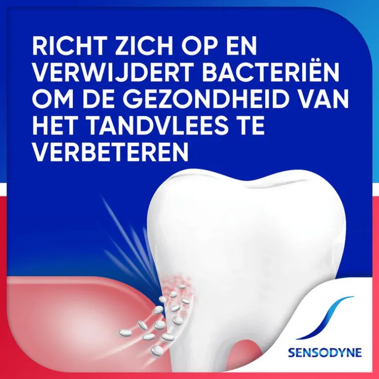 Sensodyne Gevoeligheid en Tandvlees Extra Fresh dagelijkse tandpasta biedt bescherming bij gevoelige tanden en verbeterd de tandvlees conditie. 2 x per dag poetsen met Sensodyne Gevoeligheid en Tandvlees tandpasta zorgt voor bescherming bij gevoelige tanden en een effectieve reiniging. Het bevat fluoride, dat tandglazuur versterkt en helpt beschermen tegen cariës. Sensodyne Gevoeligheid en Tandvlees tandpasta heeft een frisse muntsmaak.
