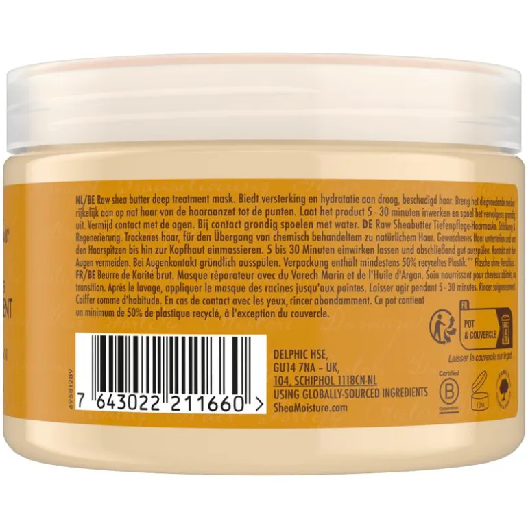 Diep verzorgend masker met raw shea butter voor extra voeding en soepelheid van het haar.