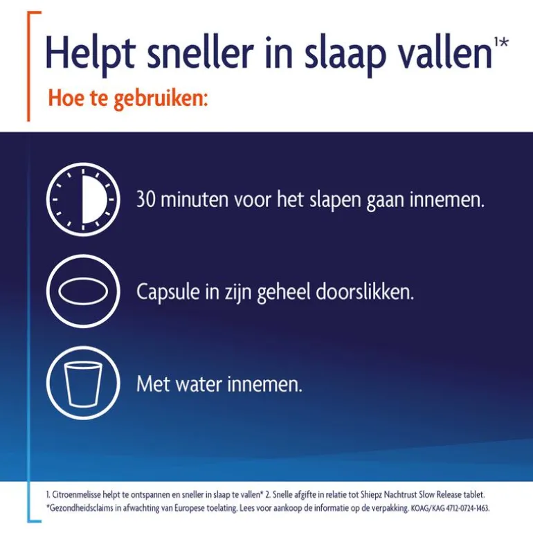 HELPT SNELLER In slaap vallen¹* ¹Citroenmelisse 80 mg: helpt te ontspannen en sneller in slaap te vallen*. Vitamine B12 1,25 µg (50% RI): draagt bij aan extra energie bij vermoeidheid. SNELLE VRIJGAVE² ²Snellere afgite in relatie tot Shiepz Nachtrust Slow Release tablet. Gezondheidsclaim in afwachting van Europese toelating. (RI = referentie inname)
