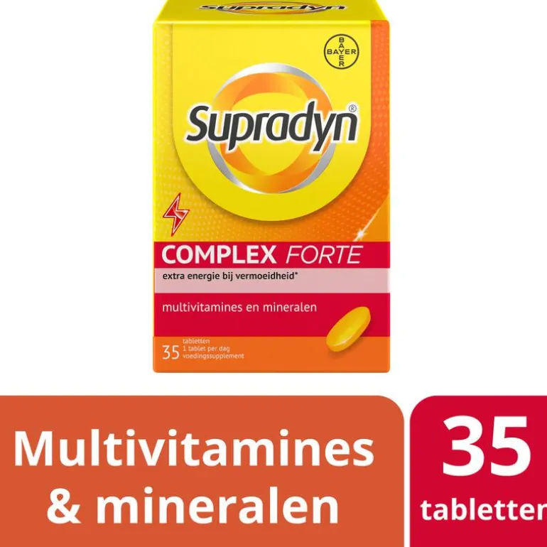 Sta actief in het leven! Supradyn Complex Forte geeft je als aanvulling op de voeding een steuntje in de rug tijdens veeleisende periodes waarin je de extra energie bij vermoeidheid goed kunt gebruiken**, zoals drukte op je werk, als je weerstand op de proef wordt gesteld, de combinatie werk/gezin. Neem als aanvulling op je dagelijkse voeding een hoog gedoseerde tablet van Supradyn Complex Forte. ; *De vitamines B2, B3, B5, B6, B12, C, het mineraal magnesium en het sporenelement ijzer activeren extra energie bij vermoeidheid. ; **Multiscope marktpeiler 2016 ; ***Vergeleken met Supradyn Complex Energy; ruim onder de maximaal veilige hoeveelheid.