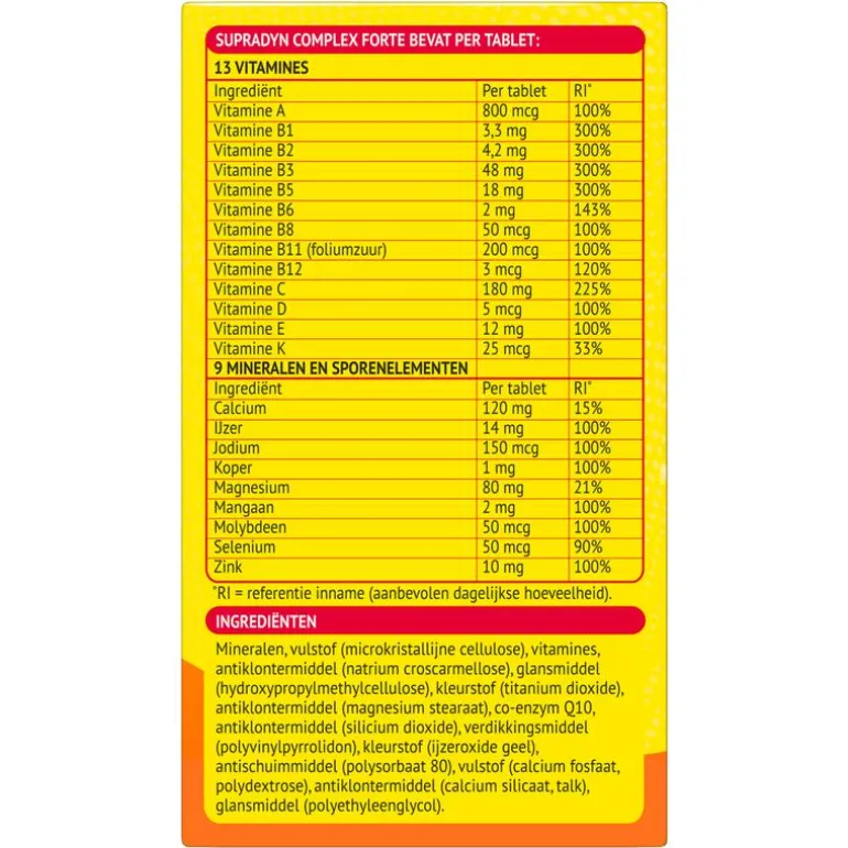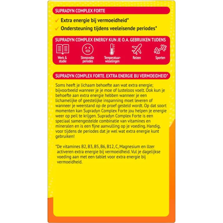Sta actief in het leven! Supradyn Complex Forte geeft je als aanvulling op de voeding een steuntje in de rug tijdens veeleisende periodes waarin je de extra energie bij vermoeidheid goed kunt gebruiken**, zoals drukte op je werk, als je weerstand op de proef wordt gesteld, de combinatie werk/gezin. Neem als aanvulling op je dagelijkse voeding een hoog gedoseerde tablet van Supradyn Complex Forte. ; *De vitamines B2, B3, B5, B6, B12, C, het mineraal magnesium en het sporenelement ijzer activeren extra energie bij vermoeidheid. ; **Multiscope marktpeiler 2016 ; ***Vergeleken met Supradyn Complex Energy; ruim onder de maximaal veilige hoeveelheid.