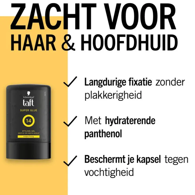 Taft Super Glue Styling Gel met instant bond-technologie geeft je haar een onmiddellijke en sterke hechting, maar plakt niet. De gel is gemakkelijk uit te wassen en is vrij van alcohol (ethylalcohol).