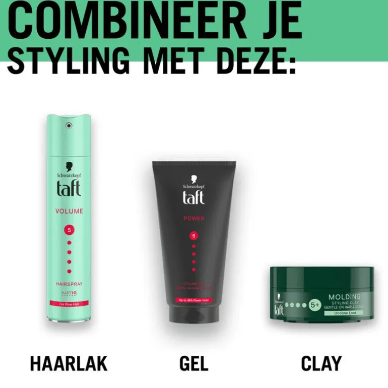 Wil je er verzekerd van zijn dat je haar de hele dag flexibel in model blijft? De Taft Molding Clay is de oplossing! Een fijne klei die je kapsel een mooie matte finish geeft en gemakkelijk is aan te brengen. Het geeft ook extra textuur aan wat dunner haar. Het voordeel van het gebruik van een klei is dat het je haar flexibel houdt en je daardoor gemakkelijk gedurende de dag je haar kunt re-stylen. Een klei is een wat drogere formule en daarom voornamelijk geschikt voor korter haar.