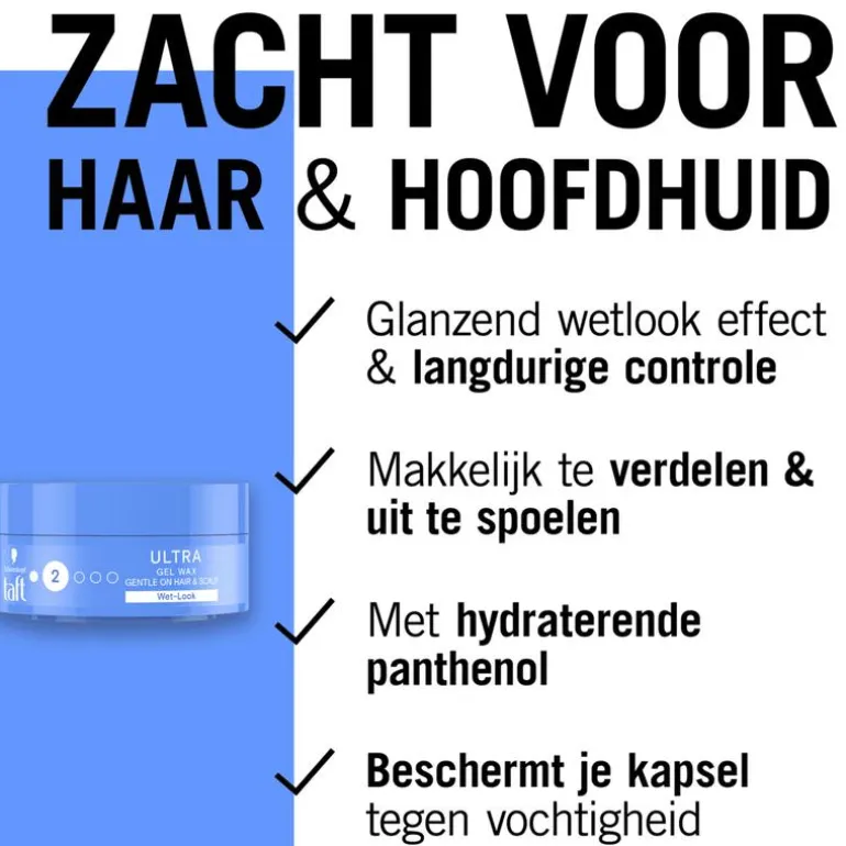 Taft Ultra Gel Wax voor tot 24 uur controle & structuur met glanzende finish. Het geeft je haar een soft wet-look effect met de hold van een gel en de structuur van een wax.