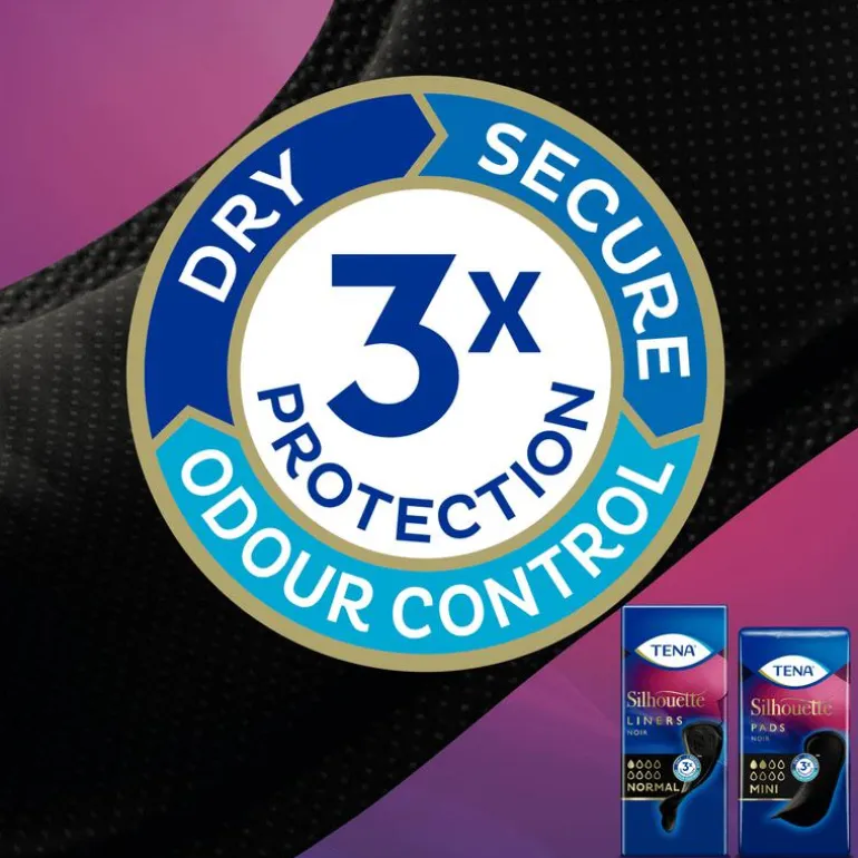 TENA Silhouette Noir Mini incontinentieverband is speciaal ontwikkeld voor zwart ondergoed voor een optimale discretie bij licht urineverlies. Of u nu in de sportschool bent om u om te kleden of thuis in uw slaapkamer, met TENA Silhouette-incontinentieverband kleedt u zich vol vertrouwen uit. Het is dun en zwart om perfect bij uw zwarte ondergoed te passen – u merkt niet eens dat u iets draagt. TENA Silhouette Noir Mini biedt drievoudige bescherming tegen doorlekken, geurtjes en een vochtig gevoel, om ervoor te zorgen dat druppels en licht urineverlies diep worden ingesloten in het verband. Het is dermatologisch getest en vrij van parfum. Onzichtbaar in uw ondergoed. Beschermt als TENA.