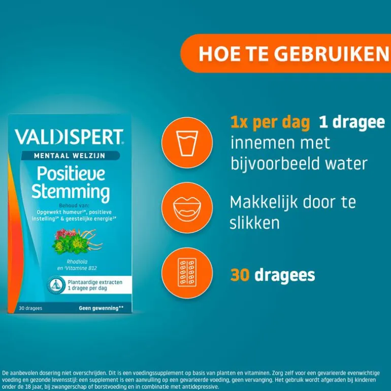 Valdispert Positieve Stemming is een product van Valdispert Mentaal Welzijn assortiment, producten die je helpen je lekker in je vel te blijven voelen, waardoor je in balans blijft en je het beste uit jezelf kunt halen. Positieve Stemming is een mix van natuurlijke plantaardige extracten zoals Rhodiola en Valeriaanwortel, en B-vitaminen. Positieve Stemming is van de hoogste kwaliteit. Valdispert, natuurlijke rustgever sinds 1924.