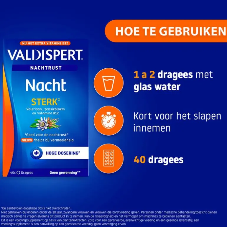 Dosering: kort voor het slapen gaan 1 tot 2 dragee innemen. De maximale aanbevolen dosering niet overschrijden. Slik de dragee(s) in z’n geheel door, bijvoorbeeld met water. Dit is een voedingssupplement. Niet gebruiken onder de 18 jaar. Neem niet méér dan de aanbevolen dagelijkse dosering en hou het middel buiten bereik van kinderen. Geschikt voor vegetariërs en veganisten.