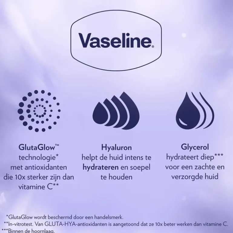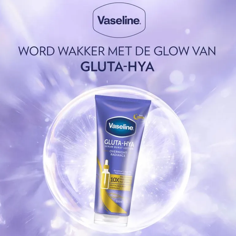 Wij geloven dat iedereen, overal een gezonde huid verdient. Vaseline Gluta-Hya Overnight Radiance Serum Burst Lotion helpt je een gezond uitziende, stralende huid te krijgen. De bodylotion bevat GlutaGlow-technologie, met antioxidanten die 10 keer krachtiger zijn dan vitamine C*. Het hyaluronzuur in de lotion verbetert het vochtgehalte van de huid en het gehydrolyseerde collageen geeft de vermoeide huid meer stevigheid. De unieke formule, die ook Vaseline Petroleum Jelly bevat, spat uiteen in waterdruppeltjes en wordt onmiddellijk en diep** opgenomen. De lotion laat een zacht, fluweelachtig gevoel achter, transformeert je huid ’s nachts en maakt een vermoeide huid steviger in vijf dagen.*In-vitrotest. Van Gluta-Hya antioxidanten is aangetoond dat ze 10x beter werken dan vitamine C. **Binnen de hoornlaag.