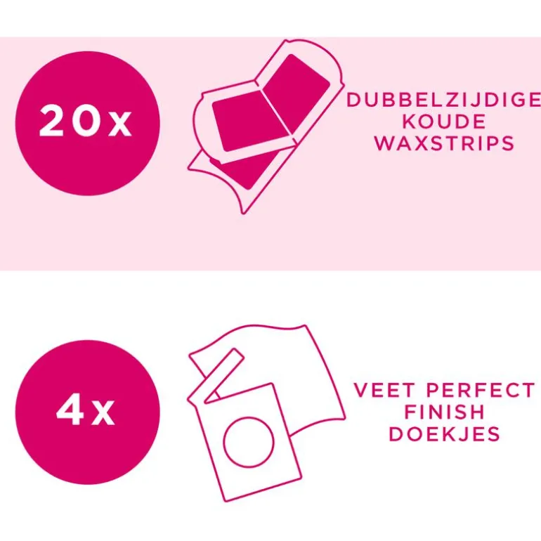 Lees voor gebruik van Veet-waxstrips zorgvuldig de voorzorgsmaatregelen op de verpakking.Zorg ervoor dat de huid voor de waxbeurt schoon en droog is. U kunt de waxstrips meer dan één keer per ontharingssessie hergebruiken tot deze niet meer kleeft. Niet meer nodig om de strips tegen elkaar te wrijven om ze uit elkaar te halen! Je krijgt een perfect resultaat in slechts 4 eenvoudige stappen:1 Trek de strips voorzichtig van elkaar met behulp van de ronde lipjes.2 Breng één strip aan op je huid in de groeirichting van de haartjes. Wrijf een paar keer in de groeirichting van de haartjes om te zorgen dat de wax goed blijft plakken.3 Houd je huid goed strak. Pak het lipje vast en trek de strip zo snel je kunt weg, tegen de haargroeirichting in. Trek de strip in één snelle beweging weg, parallel aan de huid, dus niet van de huid weg.4 Verwijder na het ontharen de wax restjes van je huid met een nabehandelingsdoekje.Niet in het toilet gooien.