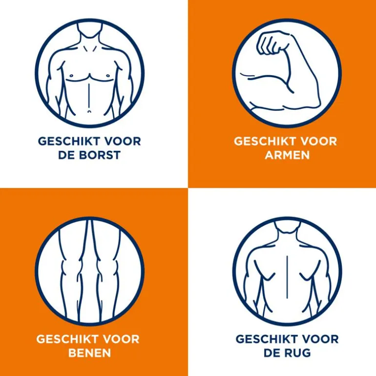 • Geschikt voor gebruik op de rug, torso, benen, armen, oksels. NIET GESCHIKT voor gebruik op het hoofd, gezicht, de ogen, neus, oren, peri-anale en genitale zones, testikels, tepels of andere lichaamsdelen.