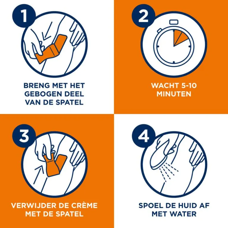 • Vermijd morsen op tapijten, kleding en vloeren.Ontharing in slechts 3 stappen:1. Verwijder de dop van de pomp en draai het om te ontgrendelen. Druk op de pomp van de Veet crème en breng deze aan op de spatel of op uw hand en verspreid egaal over het haar dat u wilt verwijderen, maar wrijf het niet in. Vergeet ook geen crèmes van uw handen te wassen. 2. Laat de crème op je huid gedurende 5 minuten en gebruik vervolgens de spatel om voorzichtig een kleine testzone van crème te verwijderen. Als de haartjes gemakkelijk loskomen, gebruik dan het bredere of smallere uiteinde van de spatel – afhankelijk van het lichaamsdeel – om de rest van de crème te verwijderen. Voor hardnekkige haartjes kan je de crème maximaal 10 minuten laten zitten – maar niet langer. 3. Spoel je huid grondig met water af om de crème volledig te verwijderen en droog daarna af. Spoel het mondstuk en de spatel grondig af na gebruik. Vervang de dop na elk gebruik.