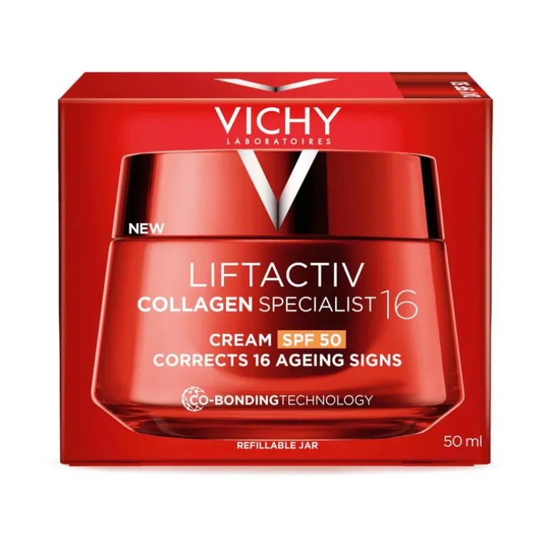 Met de leeftijd begint de productie van collageen af te nemen, wat de tekenen van huidveroudering versnelt, vooral in het gezicht. De experts van Vichy ontwikkelden Liftactiv Collagen Specialist 16 Dagcrème, verrijkt met de innovatieve Co-Bonding Technologie. Deze crème pakt 16 zichtbare tekenen van huidveroudering aan, waaronder wallen, donkere kringen, rimpels onder de ogen, kraaienpootjes, fijne lijntjes, stevigheid, verslapping, soepelheid, huidtextuur, tekenen van vermoeidheid, tonus, stevigheid, stralendheid, elasticiteit, hydratatie, gelijkmatigheid. Het resultaat: een stevigere, egalere en stralendere huid. Vichy Liftactiv Collagen Specialist 16 SPF50 is nu verrijkt met SPF50 en verkrijgbaar als handige navulling.