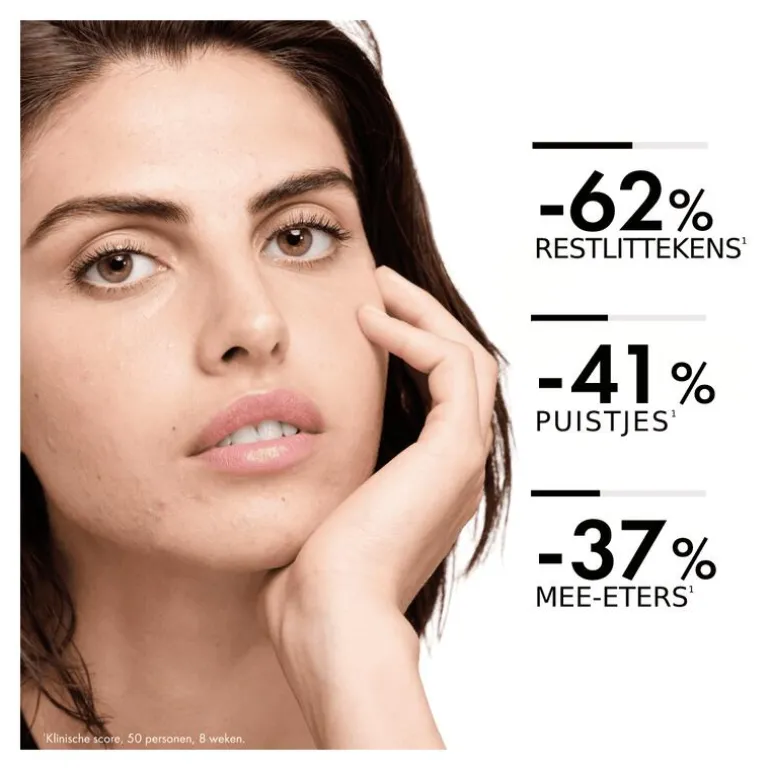 - Na 8 weken***: -37% gesloten en open comedonen, -42% rode puistjes en onzuiverheden, -62% rode en bruine vlekken, +26% huidglans.