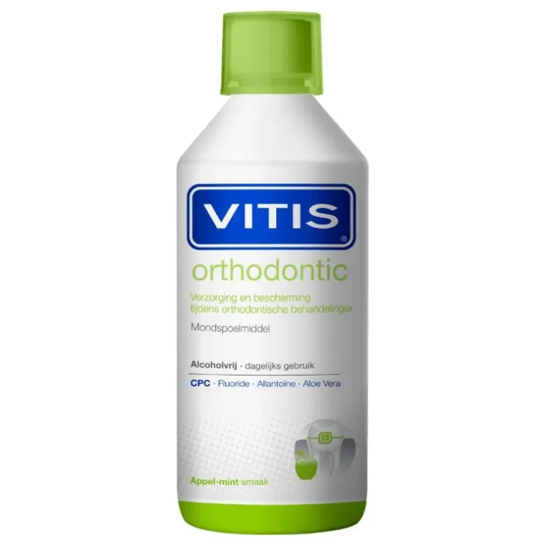 VITIS Orthodontic mondspoeling is specifiek ontwikkeld om de mond en het gebit te beschermen tegen (cariës) gaatjes, tandvleesproblemen en irritatie aan tandvlees, wangen en tong door aanwezigheid van een beugel en brackets (slotjes). Het mondspoelmiddel verzorgt en beschermt de zachte weefsels in de mond en helpt de apparatuur schoon te houden. Gebruik in combinatie met VITIS Orthodontic tandpasta.