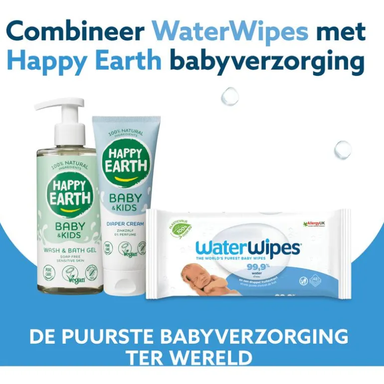 WaterWipes zijn de enige billendoekjes die alleen 99.9% water en een druppeltje fruitextract bevatten én plasticvrij zijn. We zijn dan ook het meest aanbevolen babydoekjes merk door kraamverzorgenden in Nederland. Nog steeds even puur en vriendelijk voor zelfs de meest gevoelige huid, maar nu vriendelijker voor het milieu.