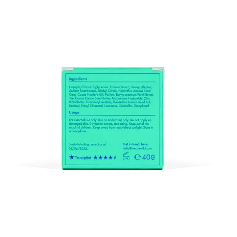 Tapioca Starch, Baking Soda, Sunflower Seed Wax, Cocoa Seed Butter, Tocopherol Acetate, Capric Glycerides, Coconut Oil, Stearyl Alcohol, Triethyl Citrate, Sunflower Seed Oil, Shea Butter, Magnesium Hydroxide, Zinc Ricinoleate, plus fragrance.