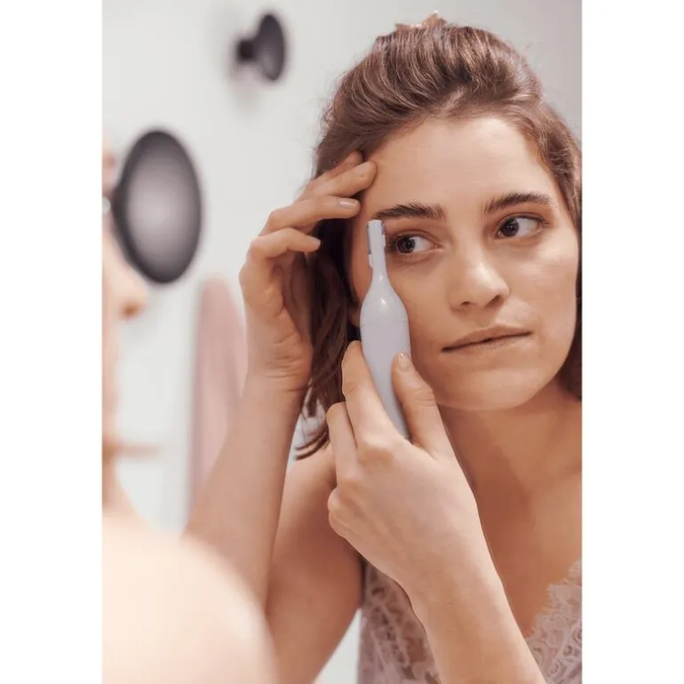 Gebruik de wenkbrauwtrimmer om wenkbrauwen vorm te geven. Kies tussen twee trimmaten (2mm en 4mm). Beweeg het apparaat tegen de haargroeirichting in. Plaats het de wenkbrauwkam over de trimmer en beweeg lichtjes tegen de richting van de haargroei in.