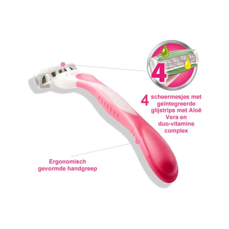 - De 2 geïntegreerde actiefstrips met Aloë Vera laten het scheermesje zachtjes over de huid glijden.