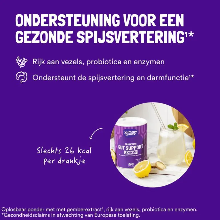Met Yummygums Gut Support Lemonade Probiotics ondersteun je een gezonde spijsvertering (gemberextract*). Dankzij de lekkere citroengembersmaak drink je het met plezier. Hydrateren en suppleren, een win-win. Yummygums Gut Support Lemonade Probiotics is plant-based en suikervrij.