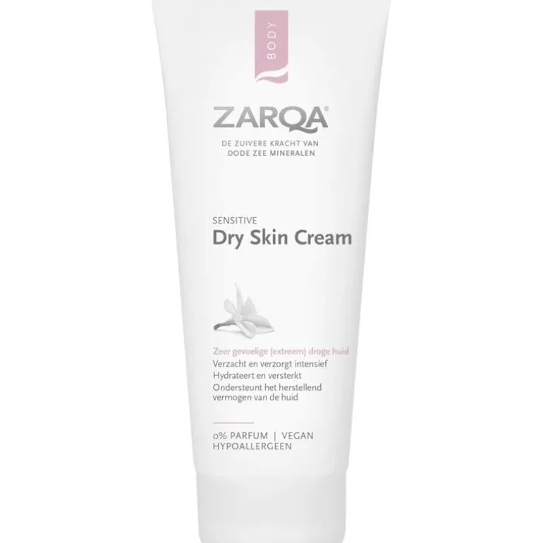 ZARQA Dry Skin Cream is een verzachtende en intensief hydraterende crème voor de rode, droge, schrale, ruwe en gevoelige huid. De voedende crème met mineralen uit de Dode Zee is speciaal ontwikkeld voor de dagelijkse verzorging en bescherming van de (extreem) droge huid. Het smeert gemakkelijk uit en trekt snel in. Het bevat een natuurlijk zilvercomplex, zink, panthenol en vitamine E. Zilver en zink geven de huid extra ondersteuning om te herstellen. Panthenol verzacht en verzorgt de rode geprikkelde huid. Vitamine E is een krachtig anti-oxidant en heeft een intensief voedende en hydraterende werking. Deze formule helpt de natuurlijke huidbarrière te versterken en de vochtbalans te verbeteren.